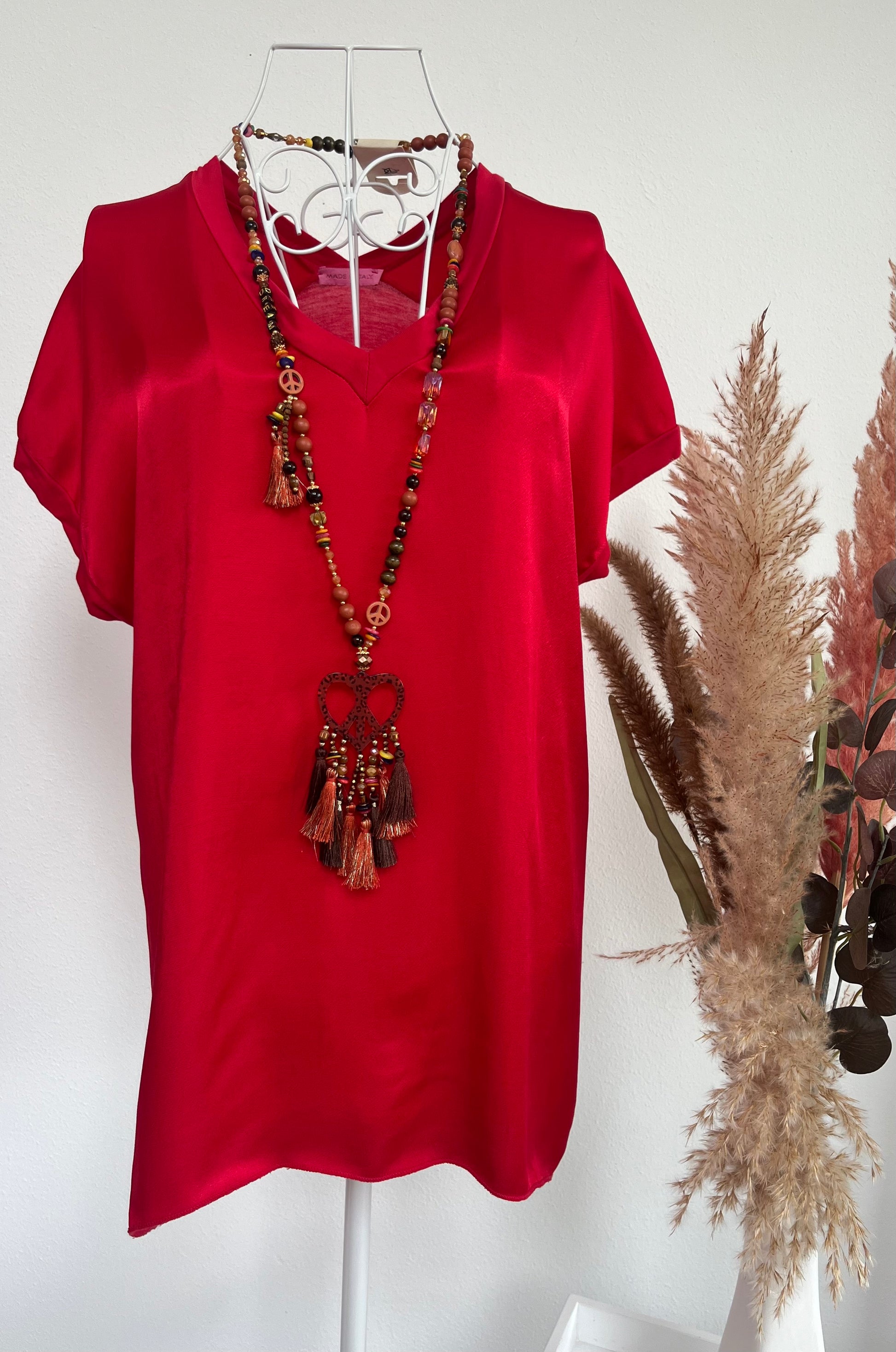 Dieses Tshirt mit V-Ausschnitt bietet sowohl vorne als auch an den Schultern eine glänzende Satinoptik und ist gleichzeitig hinten aus angenehmem Jersey Stoff gefertigt. Durch den hohen Viscose-Anteil von 95% und 5% Elastan ist es bequem und passt in der Größe von 34-42. Perfekt für jeden Anlass!